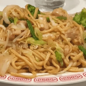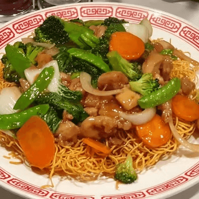 Chicken, fresh bok choy, snow peas, carrots, broccoli, and onions, stir-fried with lots of sauce over a bed of pan-fried crispy thin noodles (a.k.a Hong Kong style pan-fried noodles)