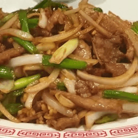 Sliced beef sautéed with green onion in dark sauce