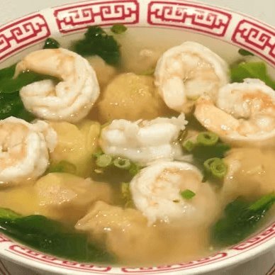 Pork dumpling served in chicken broth, topped with spinach along with all kinds of goodies (chicken, beef, and shrimp.) Broth packed separately