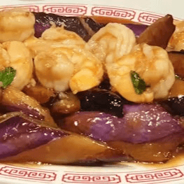 Prawns sautéed with eggplant and basil
