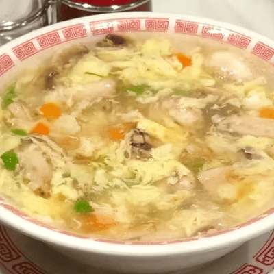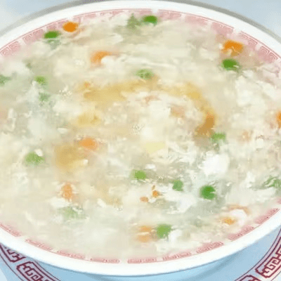 Shrimps, scallops, chicken, peas and carrots, and eggs in thick chicken broth