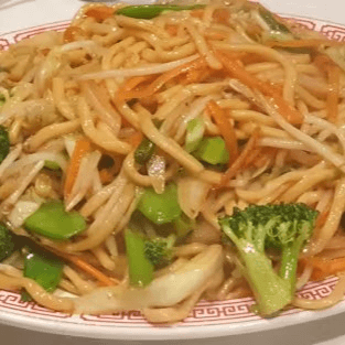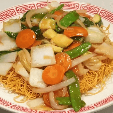 Fresh bok choy, snow peas, carrots, broccoli, zucchini, napa cabbage, and onions, stir-fried with lots of sauce over a bed of pan-fried crispy thin noodles (a.k.a Hong Kong style pan-fried noodles)