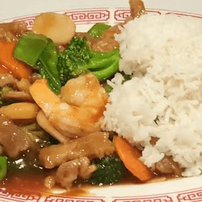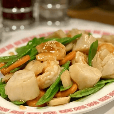 Prawns and scallops sautéed with snow peas, water chestnuts and carrots. A perfect combo
