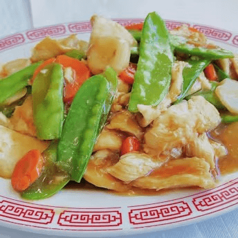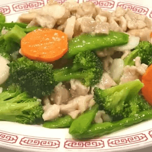 Diced chicken sautéed with broccoli, snow peas, carrots, and water chestnuts