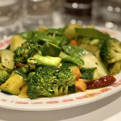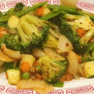 Bok choy, broccoli, snow peas, carrots, and peanuts stir-fried with spicy Kung Pao sauce. Spicy.