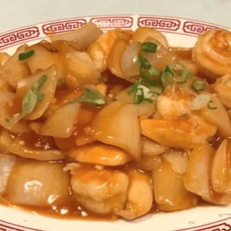 (Spicy!) Scallops sautéed with water chestnuts and bamboo shoots in hot sauce