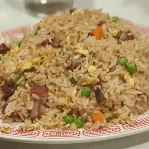 Fried rice with prawns (6), BBQ pork, eggs, peas, carrots, green onion, and yellow curry