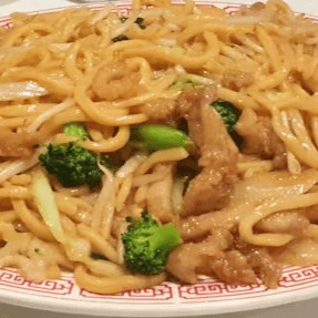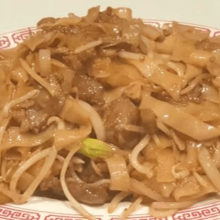 Chow fun stir-fried with beef, onions, green onions, and bean sprouts in dark sauce
