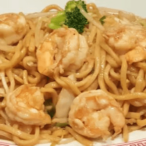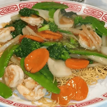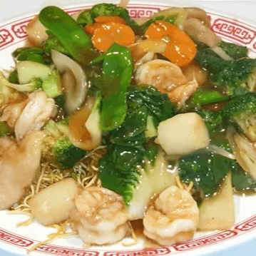 Shrimp (5), fish, and scallops (5), fresh bok choy, snow peas, carrots, broccoli, and onions, stir-fried with lots of sauce over a bed of pan-fried crispy thin noodles (a.k.a Hong Kong style pan-fried noodles)