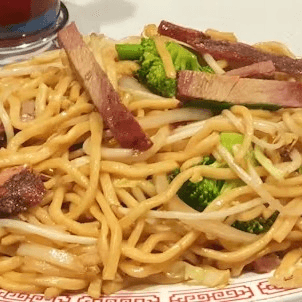 BBQ pork, fresh bok choy, snow peas, carrots, broccoli, and onions, stir-fried with lots of sauce over a bed of pan-fried crispy thin noodles (a.k.a Hong Kong style pan-fried noodles)