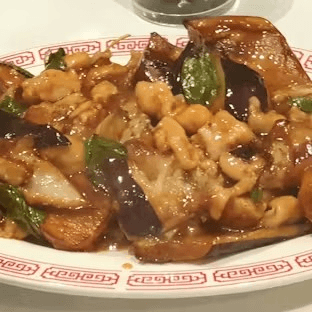 Diced chicken sautéed with fresh Chinese eggplant and basil