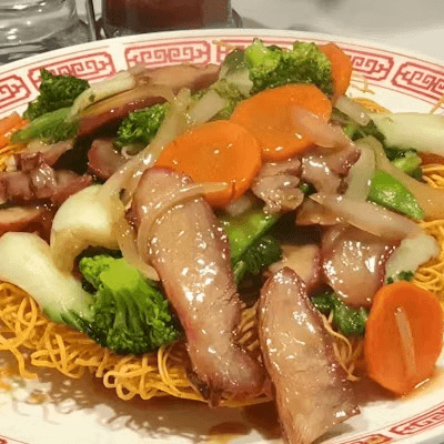 Chicken, beef, and shrimps (3), fresh bok choy, snow peas, carrots, broccoli, and onions, stir-fried with lots of sauce over a bed of pan-fried crispy thin noodles (a.k.a Hong Kong style pan-fried noodles)