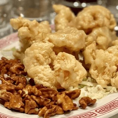 Prawns lightly breaded and fried, mixed with a slightly sweet cream sauce and glazed walnuts. All-time favorite! Contains dairy