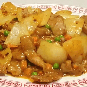 Sliced beef sautéed with peas, carrots, and yellow onions in mild yellow curry with chili