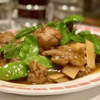 Sliced beef sautéed with snow peas and bamboo shoots