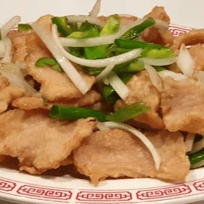 Meaty boneless pork chop strips tossed-cooked with green and yellow onions and jalapeños