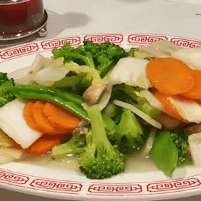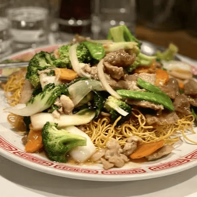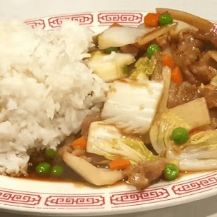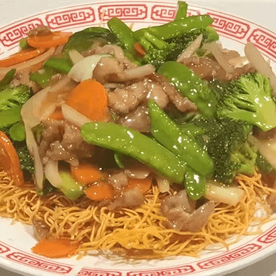 Sliced beef sautéed with peas and carrots, bamboo shoots, and Napa cabbage, in imported oyster sauce