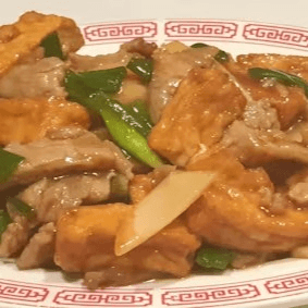 Sliced beef sautéed with bean cake (tofu), bamboo shoots, and green onions
