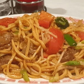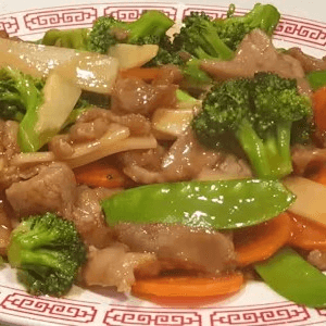 Sliced beef sautéed with snow peas, water chestnuts, carrots, broccoli, mushrooms, etc