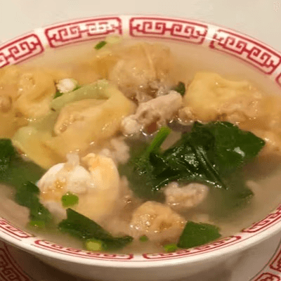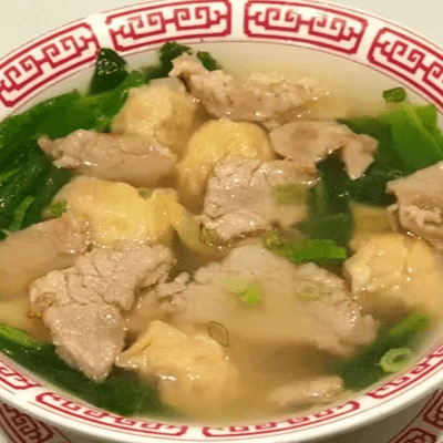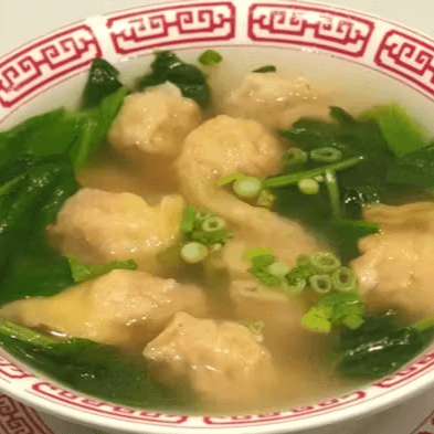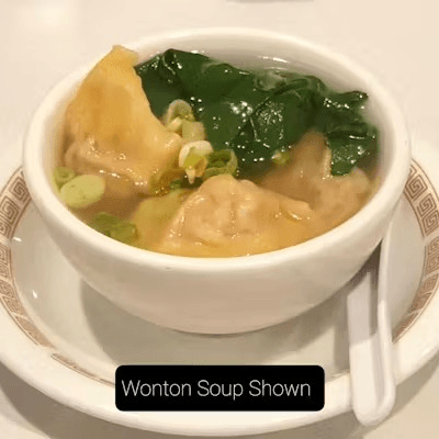 Pork dumpling served in chicken broth, topped with spinach. Broth packed separately