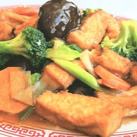 Bean cake sautéed with black mushrooms, bamboo shoots, carrots, and broccoli