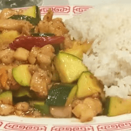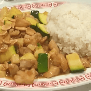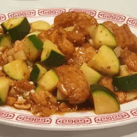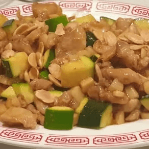 Diced chicken sautéed with zucchini, bamboo shoots, and peanuts, in spicy Kung Pao sauce. Spicy.