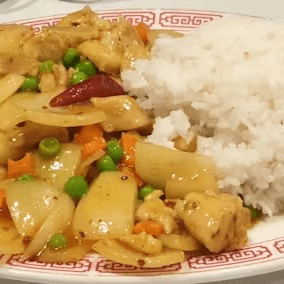 Diced chicken sautéed with peas, carrots, onions and zucchini, in yellow curry sauce. Spicy.
