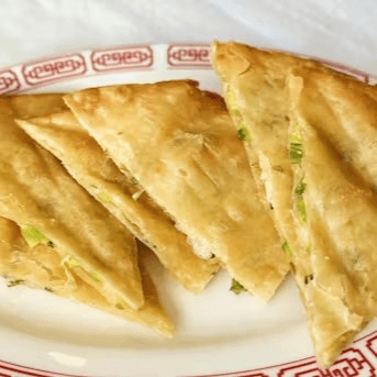 Green onion and whipped egg sandwiched between 2 thin pastries. Deep fried to golden brown