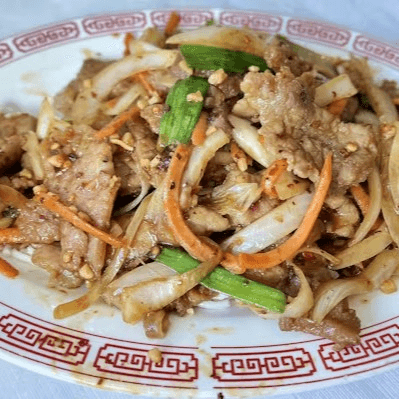 Thin slices of tender beef marinated and toss-cooked with green and yellow onions, shredded carrots, and chili pepper. A must at Lai Lai
