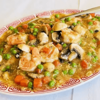 Prawns sautéed with whipped eggs, peas, and carrots, mushrooms, and black beans in special lobster flavored sauce. Lobster not included