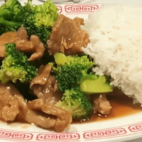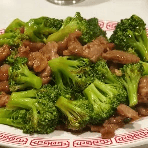 Sliced beef sautéed with fresh broccoli in dark sauce