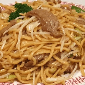 Beef, fresh bok choy, snow peas, carrots, broccoli, and onions, stir-fried with lots of sauce over a bed of pan-fried crispy thin noodles (a.k.a Hong Kong style pan-fried noodles)