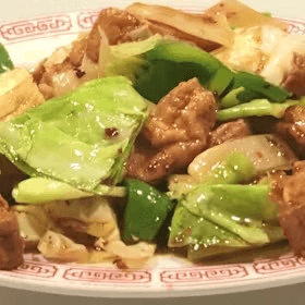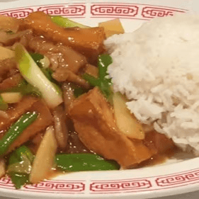 Fried tofu sautéed with cabbage, bell peppers, and bamboo shoots in hoisin sauce. Spicy.