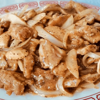 Tender beef stir-fried with fresh mushrooms, yellow onions, and seasoned with ground black pepper. Spicy.