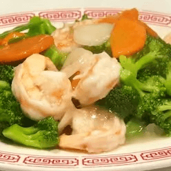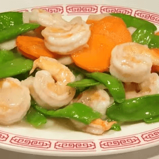 Prawns sautéed with snow peas, water chestnuts, carrots, and broccoli