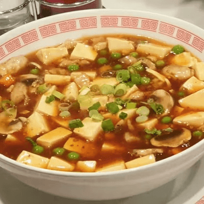 Diced tofu sautéed with minced pork, mushrooms, peas, and carrots in chili sauce