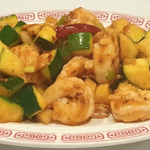 Prawns cooked with zucchini, green onion, peanuts, and bamboo shoots in a hot and spicy sauce