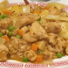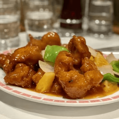 Nuggets of chicken breast deep-fried in batter and sautéed with carrots, bell peppers, onions, and pineapples in sweet and sour sauce