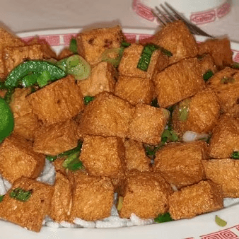 Seasoned crispy fried tofu bites, with chopped onions and jalapeños. Spicy.