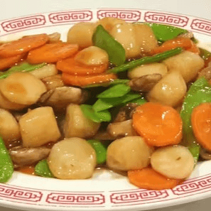 Scallops sautéed with snow peas, mushrooms, carrots, and water chestnuts